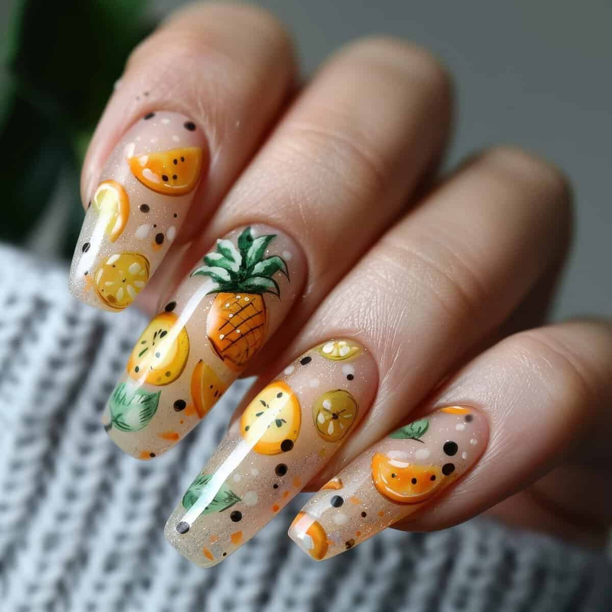 Wenn du nicht alle Nägel kunterbunt gestalten möchtest, ist ein Ombré-Look eine schöne Option. Ein sanfter Farbverlauf von Rosa zu Weiß oder ein Übergang von Türkis zu Pastellblau sieht sehr sommerlich aus, wirkt aber insgesamt harmonisch. Wer gern kleine Motive hat, kann mit Palmen, Blüten oder Früchten Akzente setzen. Ein dezentes Ananas- oder Blätter-Design auf nur einem Nagel lockert den Look auf und verbreitet Urlaubsfeeling, ohne zu überladen zu sein.